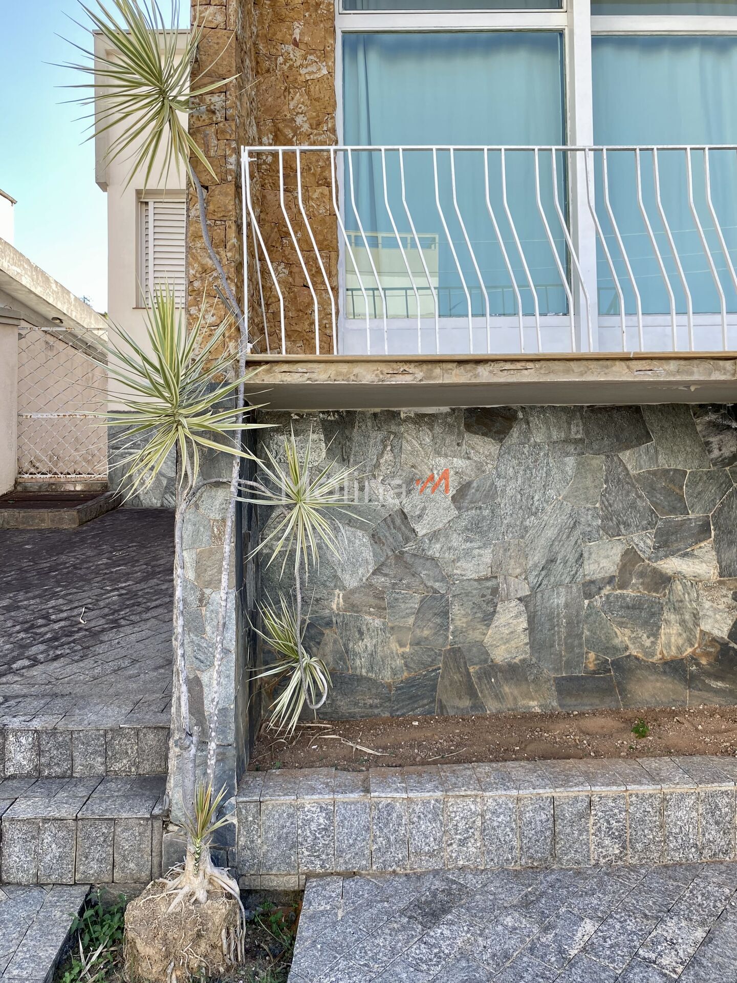 A escada na entrada é imponente e a varanda dá continuidade à sala, que possui uma grande abertura para a fachada entrando muita luz e ventilação.